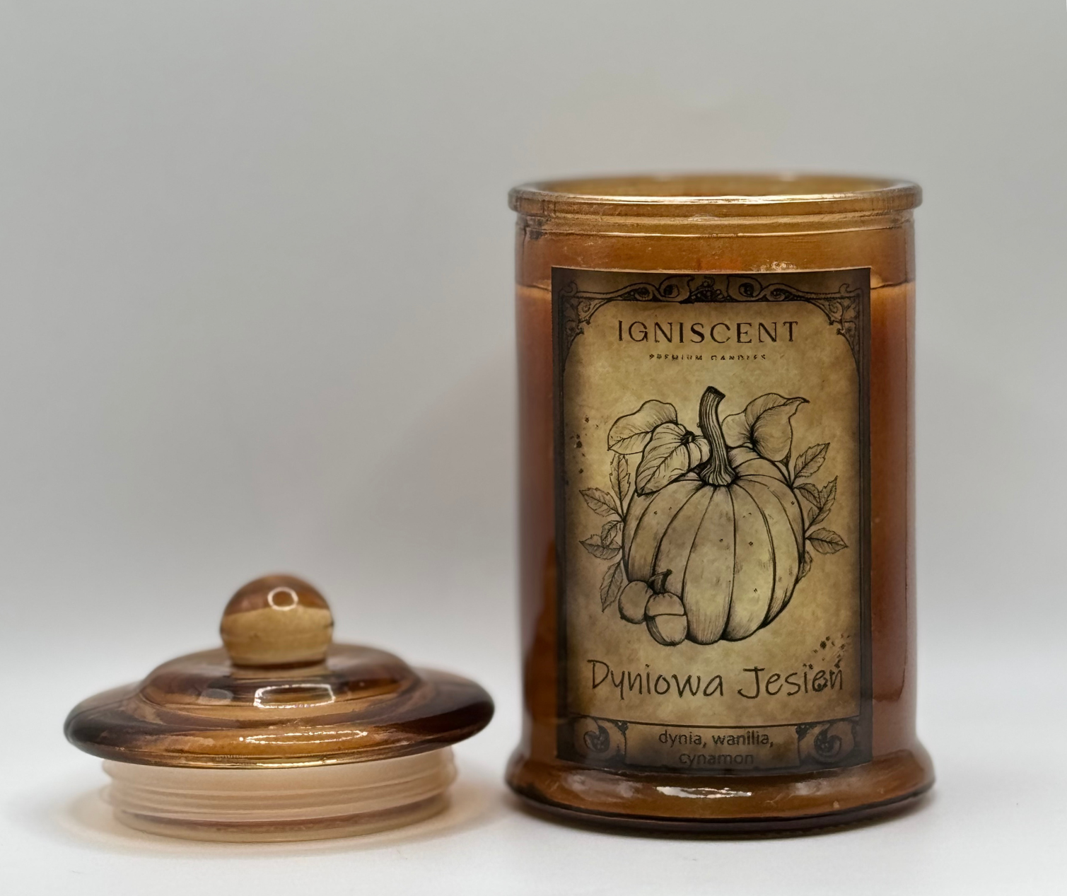Świeca zamknięta jest w eleganckim, wysokim szklanym słoju w odcieniu bursztynowego brązu, który subtelnie rozprasza światło płomienia, tworząc ciepły, nastrojowy blask. Szklane wieczko z ozdobnym uchwytem dodaje całości klasy i pozwala zachować świeżość zapachu na dłużej.