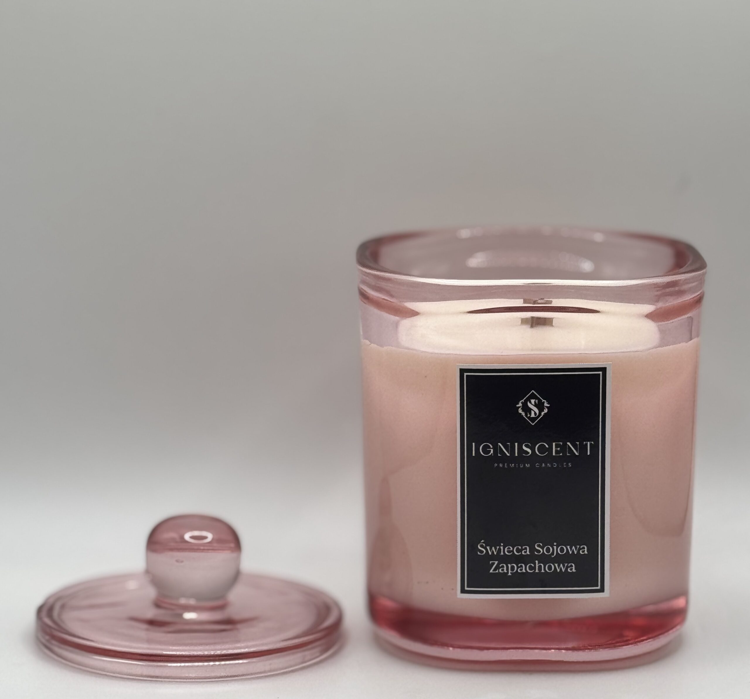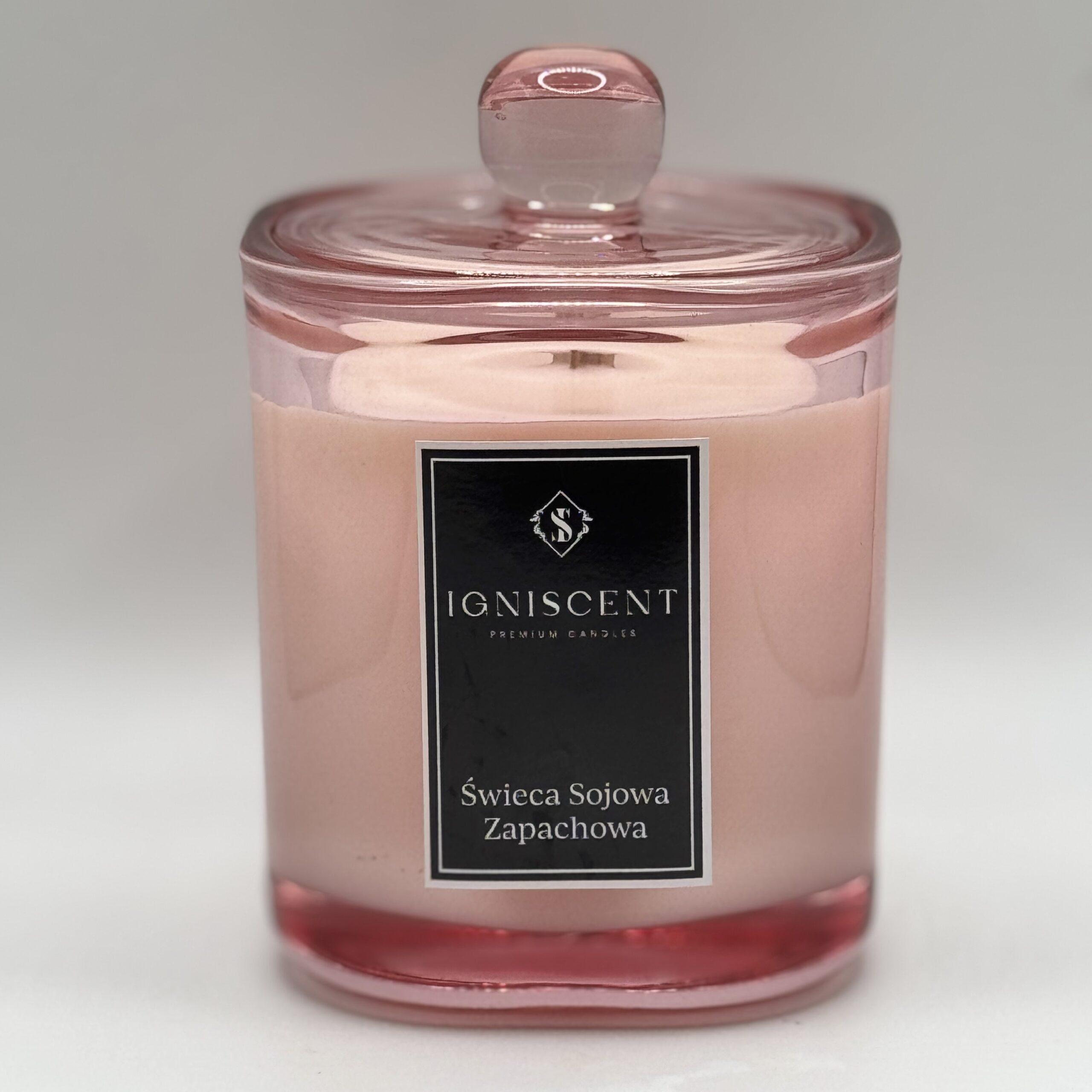 Zaokrąglony kształt naczynia i szklane wieczko z dekoracyjnym uchwytem dodają całości ponadczasowej elegancji. To projekt, który łączy klasykę z nutą nowoczesnego luksusu – minimalistyczna czarna etykieta z logo Igniscent Premium Candles stanowi wyraźny akcent na tle delikatnego różu, przywodząc na myśl biżuteryjny detal wśród płomieni.