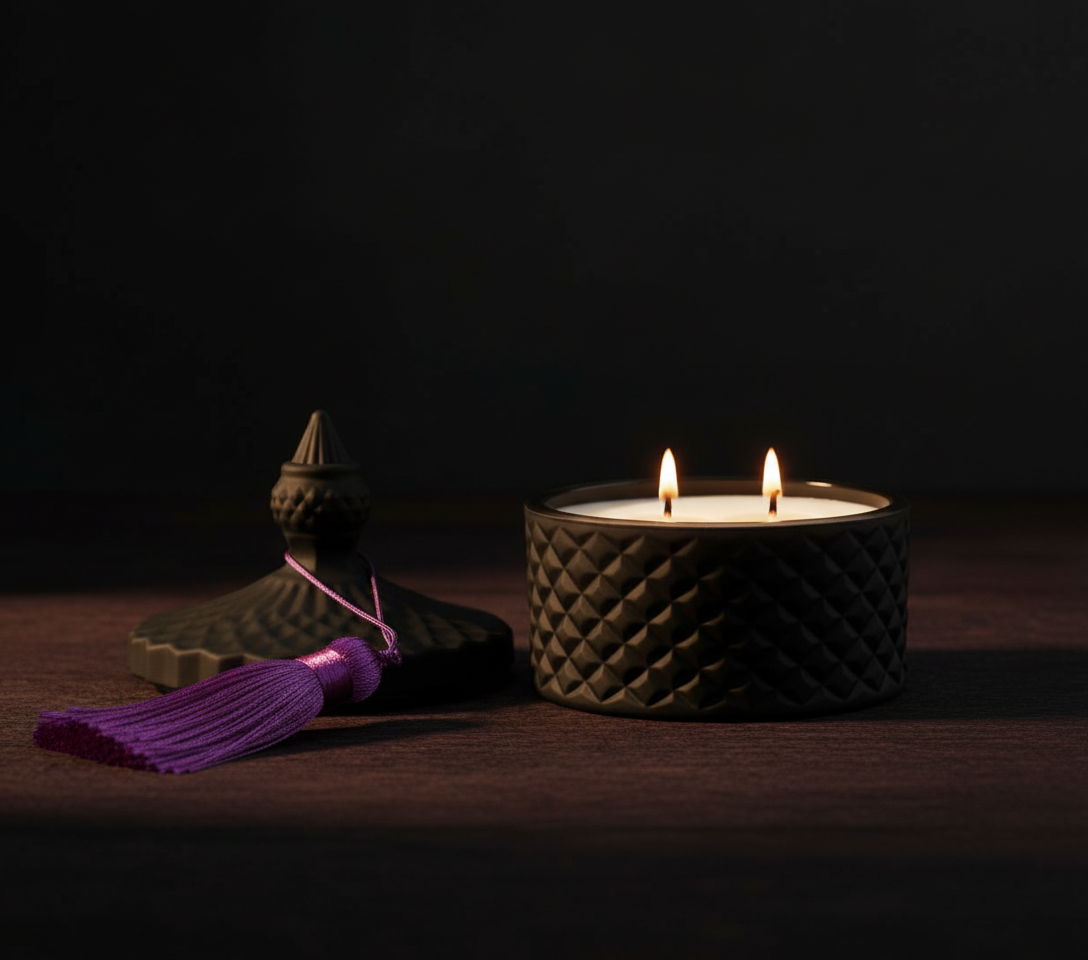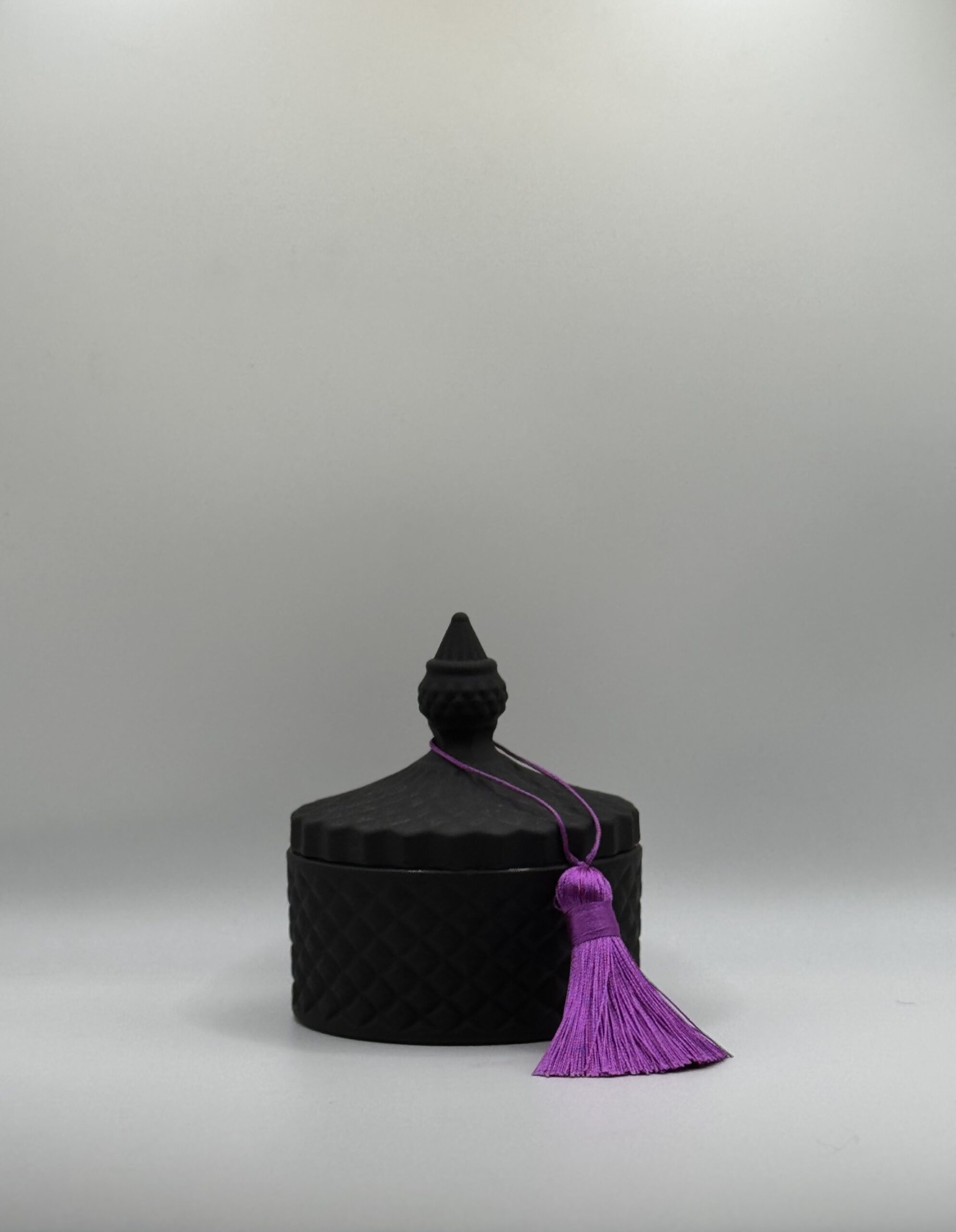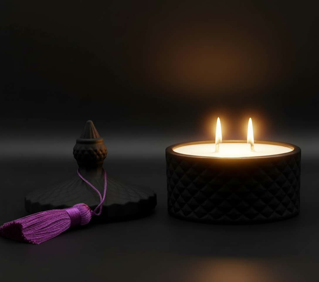 Pojemnik świecy wykonany jest z wysokiej jakości szkła, utrzymanego w intensywnie czarnym, lustrzanym wykończeniu, które nadaje mu wyjątkowo luksusowy i ekskluzywny charakter. Jego powierzchnię zdobi elegancka, diamentowa faktura, pięknie odbijająca światło i tworząca subtelne refleksy podczas palenia świecy.