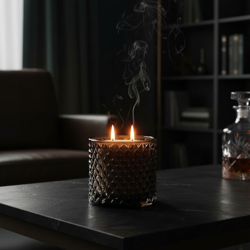 Pojemnik świecy wykonany jest z wysokiej jakości szkła, utrzymanego w intensywnie czarnym, lustrzanym wykończeniu, które nadaje mu wyjątkowo luksusowy i ekskluzywny charakter. Jego powierzchnię zdobi elegancka, diamentowa faktura, pięknie odbijająca światło i tworząca subtelne refleksy podczas palenia świecy.