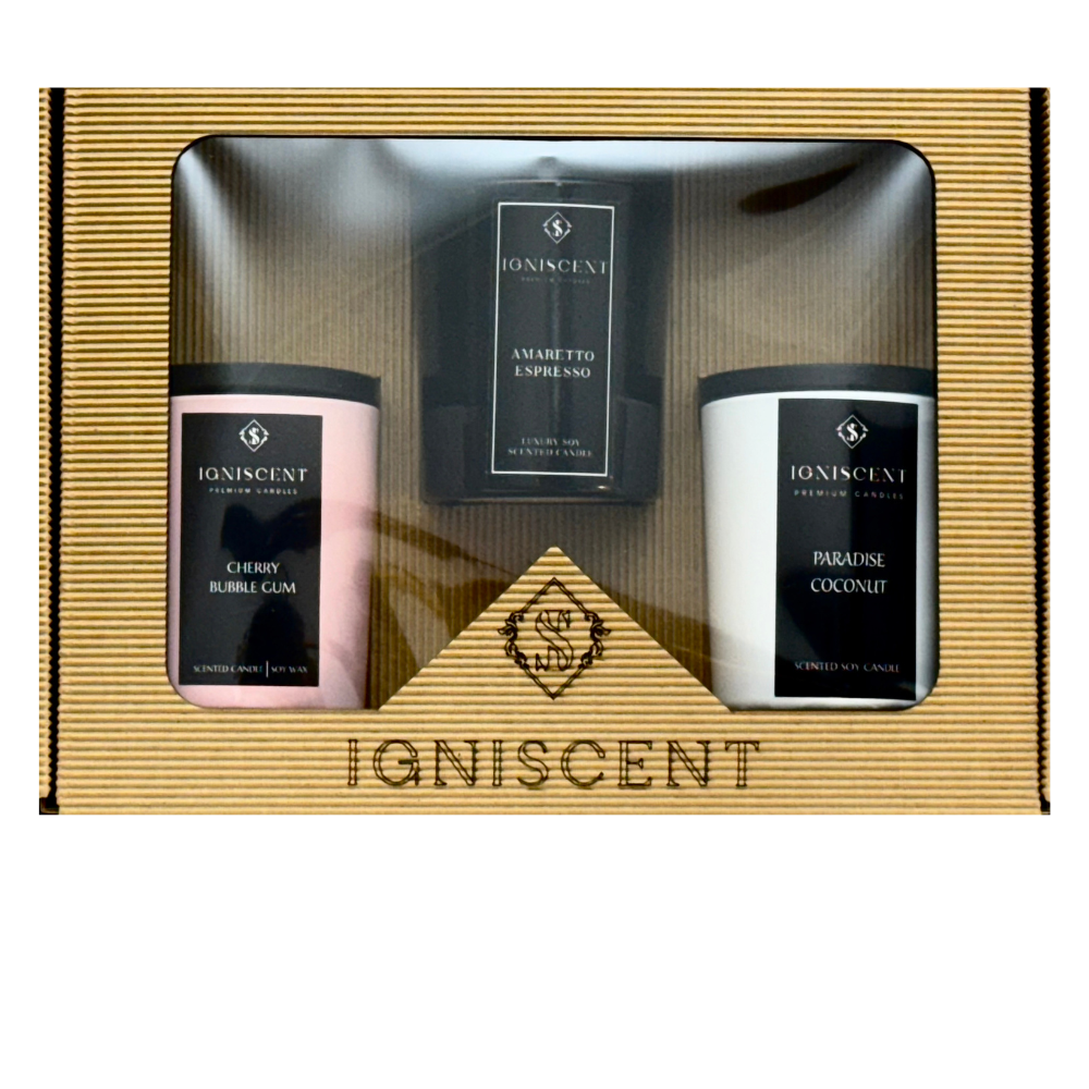 W zestawie znajdują się trzy świece zapachowe w klasycznym szkle w kolorach: czarnym, białym i czerwonym. Każda świeca została wykonana z wysokiej jakości wosku sojowego i wyposażona w drewnianą nakrywkę z grawerowanym logo Igniscent, która chroni wosk przed kurzem, pomaga zachować intensywność zapachu oraz podkreśla naturalny, rzemieślniczy charakter produktu.