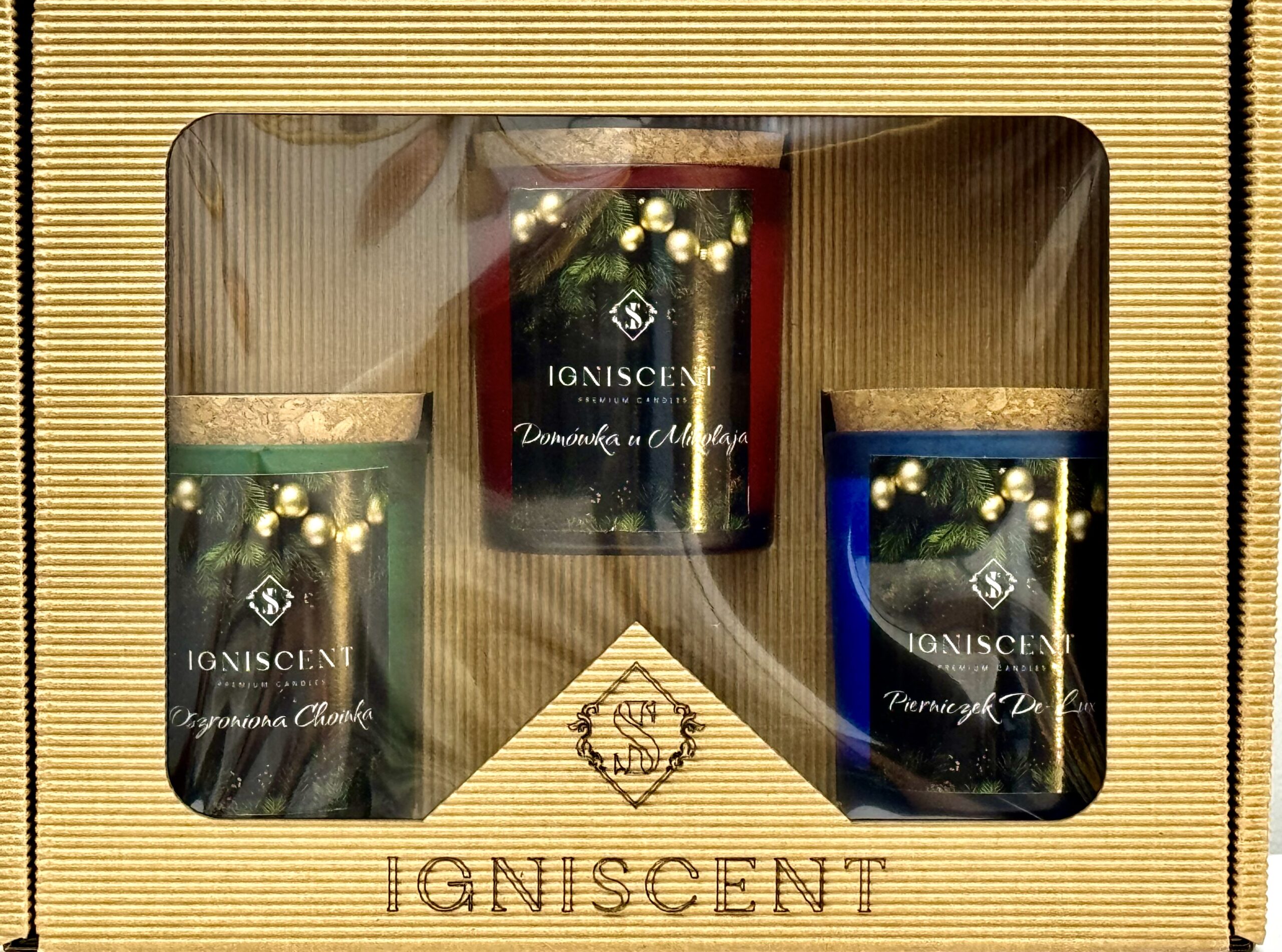 W zestawie znajdują się trzy świece zapachowe w klasycznym szkle w kolorach: niebieskim, czerwonym i zielonym. Świece zapakowane są w eleganckie opakowanie prezentowe, dzięki czemu produkt jest gotowy do wręczenia bez potrzeby dodatkowego pakowania.