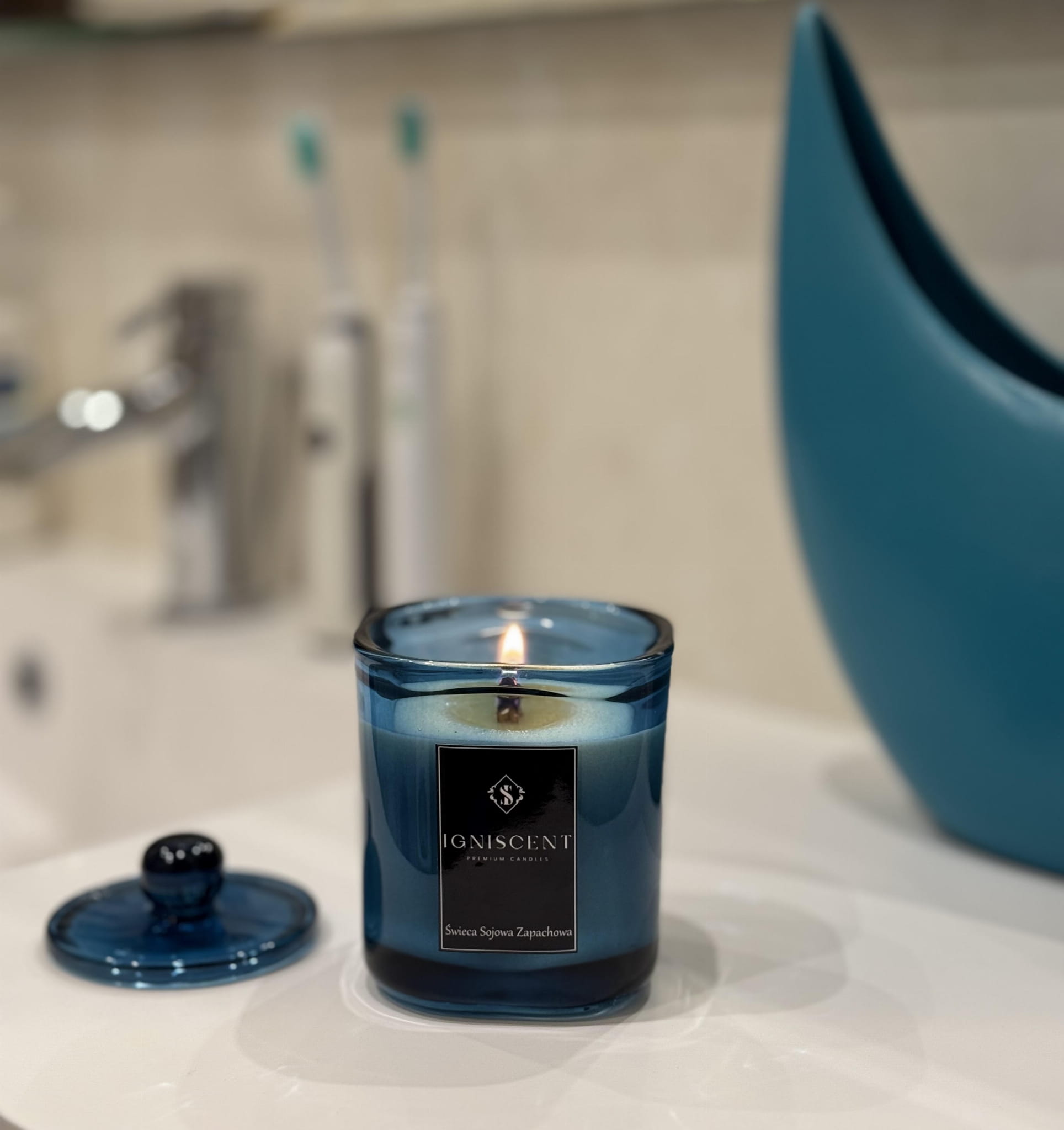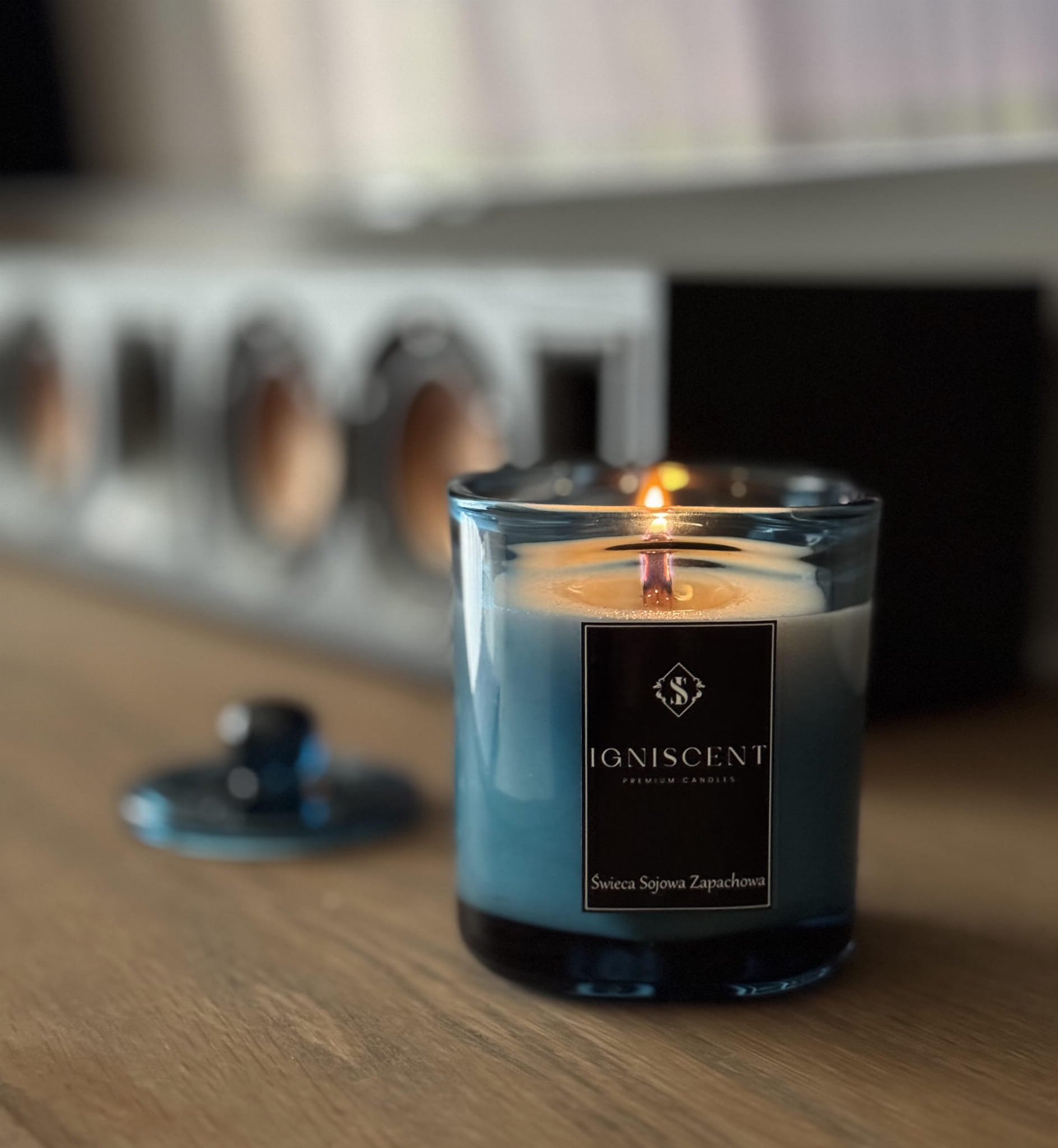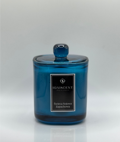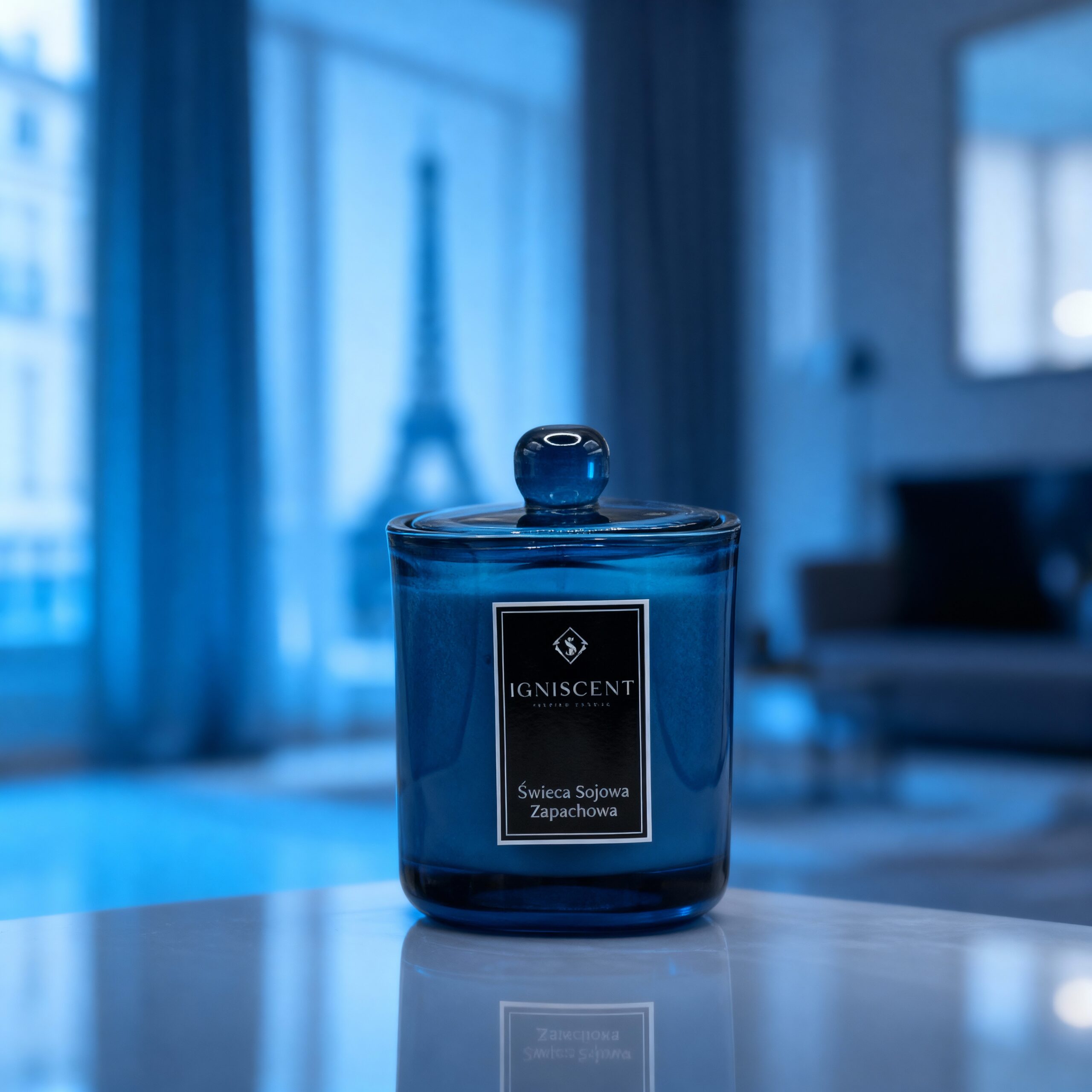 Świeca sojowa Paryskie Życie Igniscent Premium Candles została umieszczona w masywnym, wysokiej jakości szklanym, błyszczącym słoiku w głębokim odcieniu niebieskiego. Półprzezroczyste szkło pięknie rozprasza światło, tworząc nastrojową poświatę. Pokrywka z charakterystycznym, zaokrąglonym uchwytem dopełnia całość, nadając produktowi elegancki i ponadczasowy wygląd. Lśniąca, szkliście gładka powierzchnia tworzy luksusowy efekt, odbijając światło niczym polerowany kyanit.