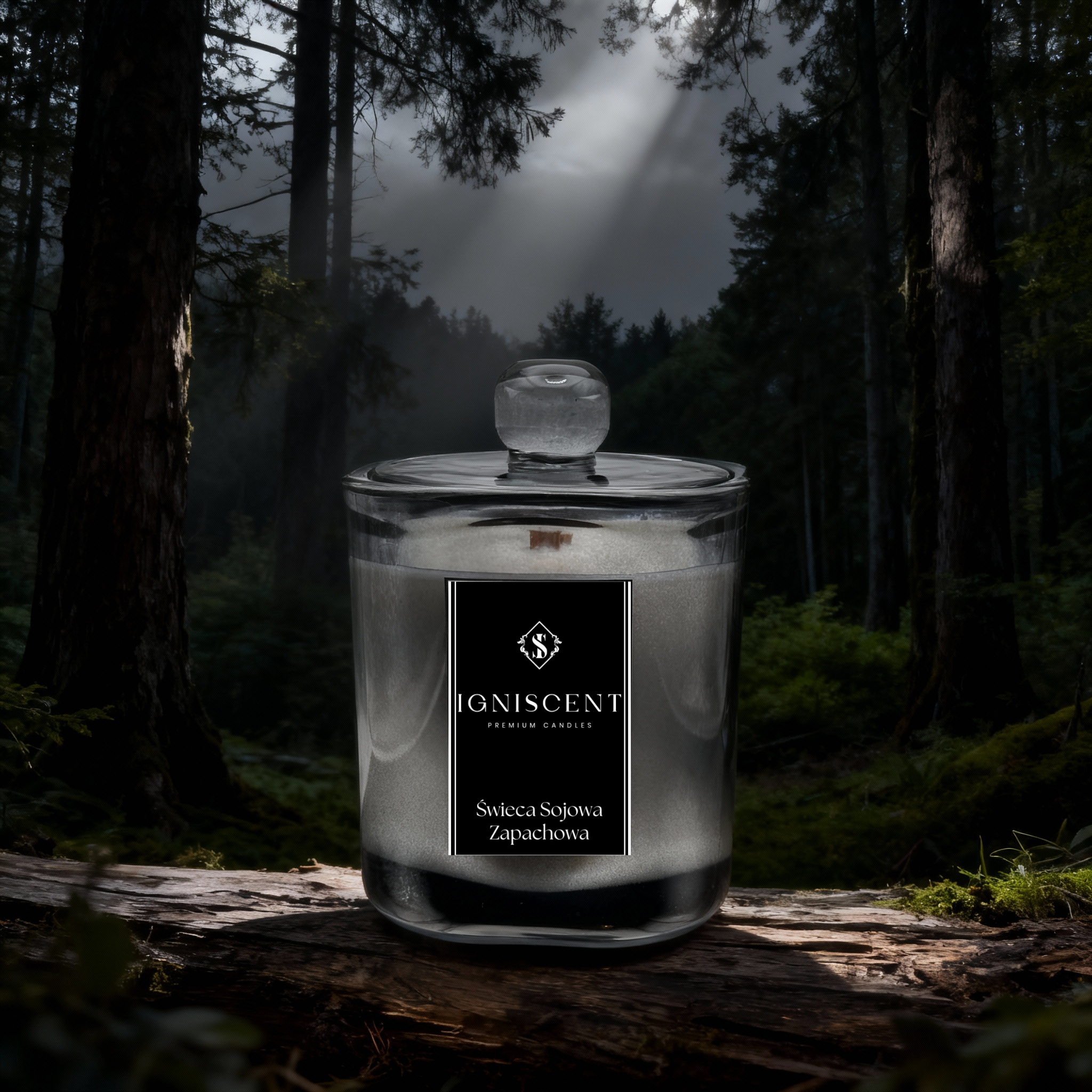 Wieczko z uchwytem, wykonane z tego samego materiału, dopełnia harmonii całego projektu. Zapewnia funkcjonalność oraz estetykę. Czarna etykieta z finezyjnym logo Igniscent i delikatnym obramowaniem dodaje luksusowego akcentu, tworząc produkt doskonały zarówno jako źródło aromatycznego ciepła, jak i dekoracyjny element stylowego wnętrza. Całość idealnie oddaje enigmatyczny, naturalny charakter zapachu, który przenosi zmysły w głąb magicznego lasu pełnego sekretów.