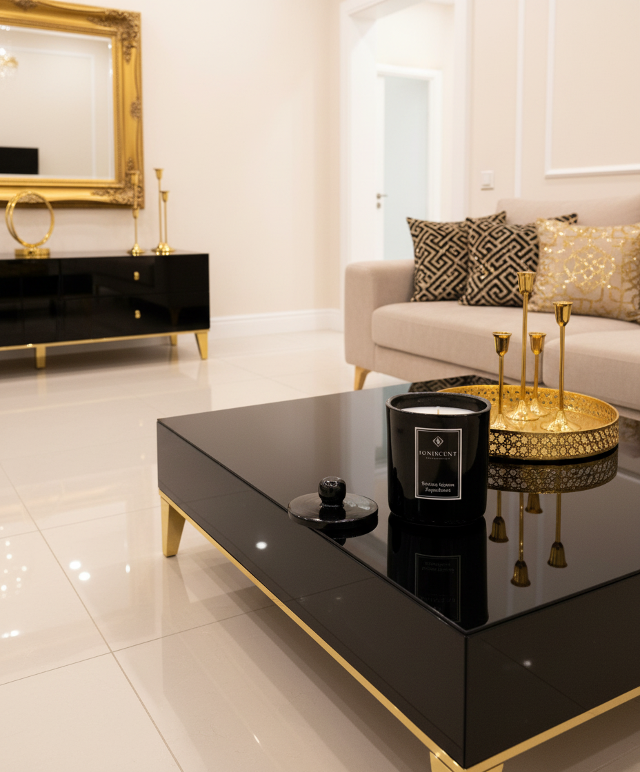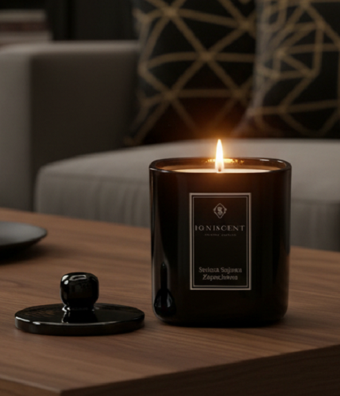 Pojemnik świecy sojowej Igniscent Premium Candles w kolorze głębokiej czerni emanuje elegancją i tajemniczością. Lśniąca, szkliście gładka powierzchnia tworzy luksusowy efekt, odbijając światło niczym polerowany onyks. Czarne wieczko, zwieńczone okrągłym uchwytem, harmonijnie komponuje się z resztą naczynia, dodając mu nowoczesnego, ale jednocześnie klasycznego charakteru.